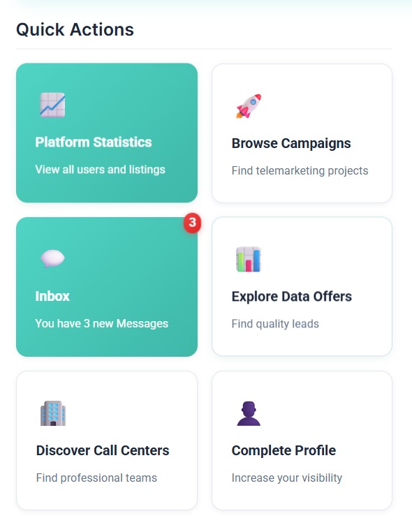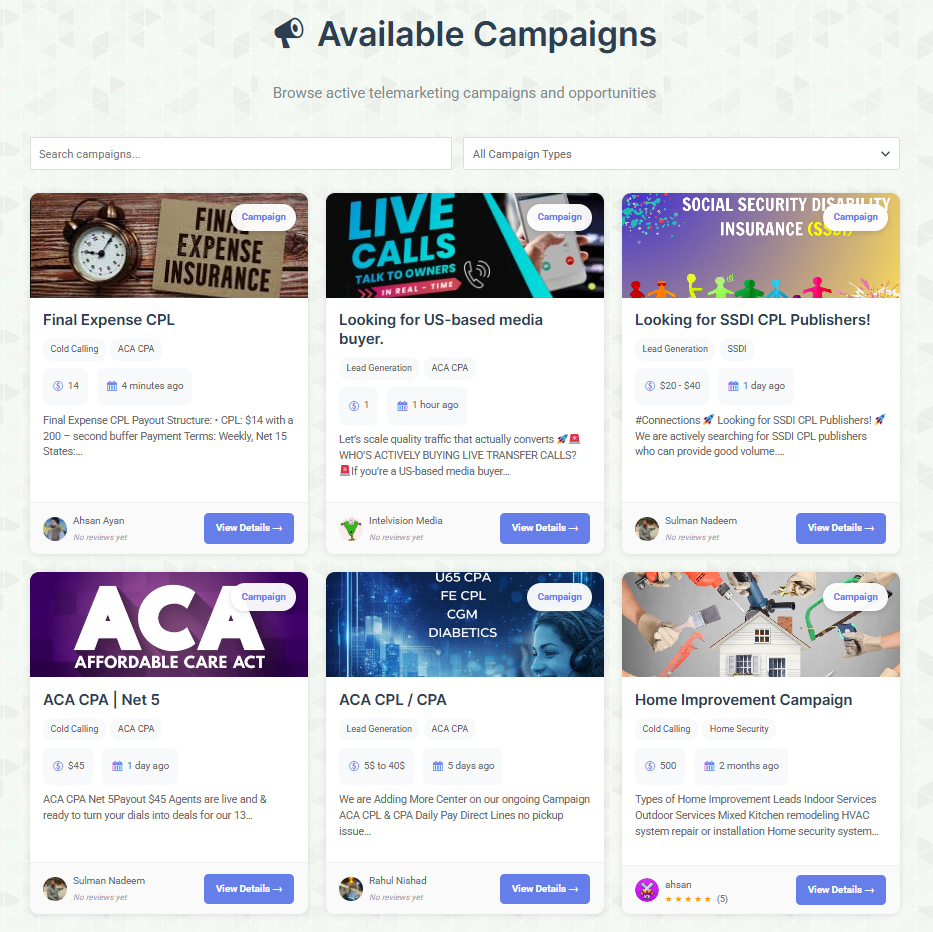 Every user—data vendor, campaign buyer, call center, or individual—gets a dedicated public profile showcasing their identity, reviews, activities, and credibility.